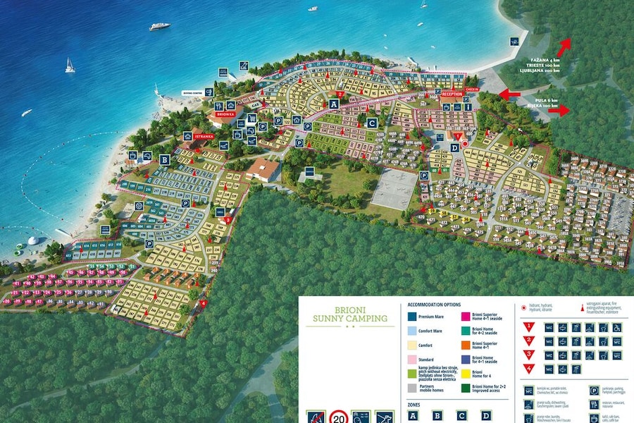Brioni Sunny Camping est installé dans un cadre ensoleillé et boisé sur la côte adriatique de la Croatie. Le camping dispose d’un accès direct à une plage privée de galets, parfaitement aménagée pour votre confort. C’est l’endroit rêvé pour se détendre, bronzer et nager. Vous y trouverez des douches de plage et des cabines pour vous changer. Les amateurs de sensations aquatiques seront ravis de découvrir un parc aquatique flottant en mer ! Et pendant que vous profitez des plaisirs aquatiques sous le soleil croate, vous pouvez admirer les eaux turquoise et apercevoir les îles Brioni à l’horizon.Des activités pour toute la famille